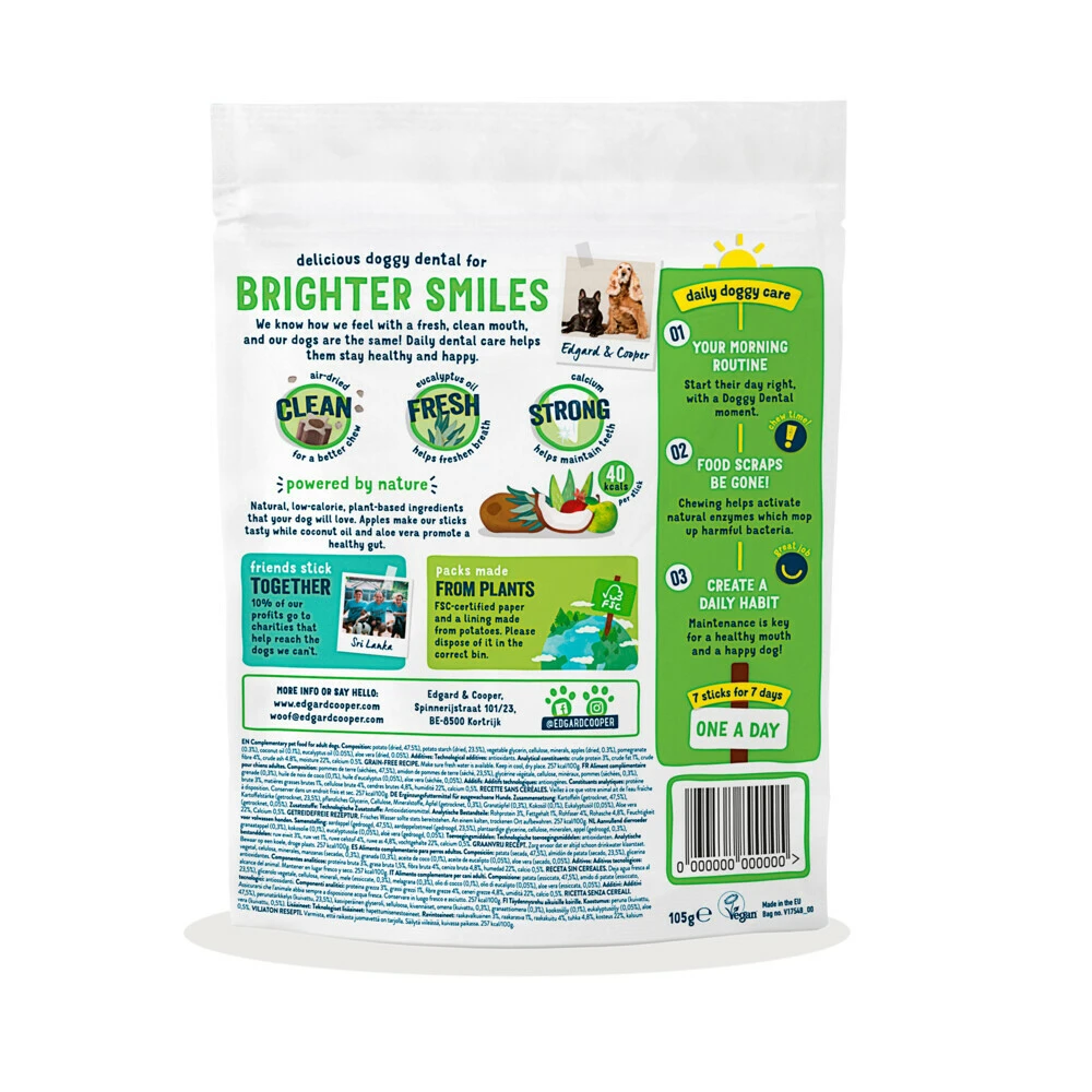 Edgard & Cooper Doggy Dental Sticks Appel & EucalyptusolieDe Dental Sticks van Edgard & Cooper helpen jouw hond aan een schoon gebit, frisse adem én sterke tanden! De sticks zijn luchtgedroogd waardoor je hond er véél langer op kauwt voor meer effect en fun. Gemaakt van gezonde plantaardige ingrediënten die van nature caloriearm zijn, zoals knapperige appel en adem verfrissende eucalyptusolie.Geef je hond één stick per dag voor een effectieve p