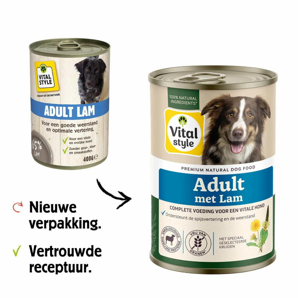 VITALstyle Hondenvoer Bik Lam VITALstyle (voorheen ECOstyle) Hondenvoer Lam is blikvoeding in een uitgebalanceerde mix van vers vlees, groenten, aardappel en kruiden. De voeding bestaat uit hoogwaardige ingrediënten en de juiste verhouding aan eiwitten, energie, vetten, vitaminen en mineralen. Voer het als complete voeding, als aanvulling op de brokken of als beloning. ADULT LAM is ook geschikt voor honden die extra energie nodig hebben. Kortom, een breed inzetbare, natuurlijke voeding