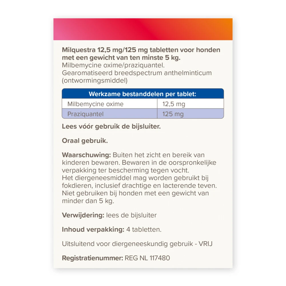 Beaphar Milquestra Ontworming Tabletten Hond 5 – 75kgBreedspectrum ontwormingsmiddel voor honden vanaf 5kg op basis van Milbemycine oxime en Praziquantel.Eenvoudig toe te dienen: meestal slechts 1 tablet per dier;kleine tabletten met rundvleessmaak;breedst werkend ontwormingsmiddel;bevat de nr. 1 gebruikte werkzame stoffen voor ontworming in Nederland.