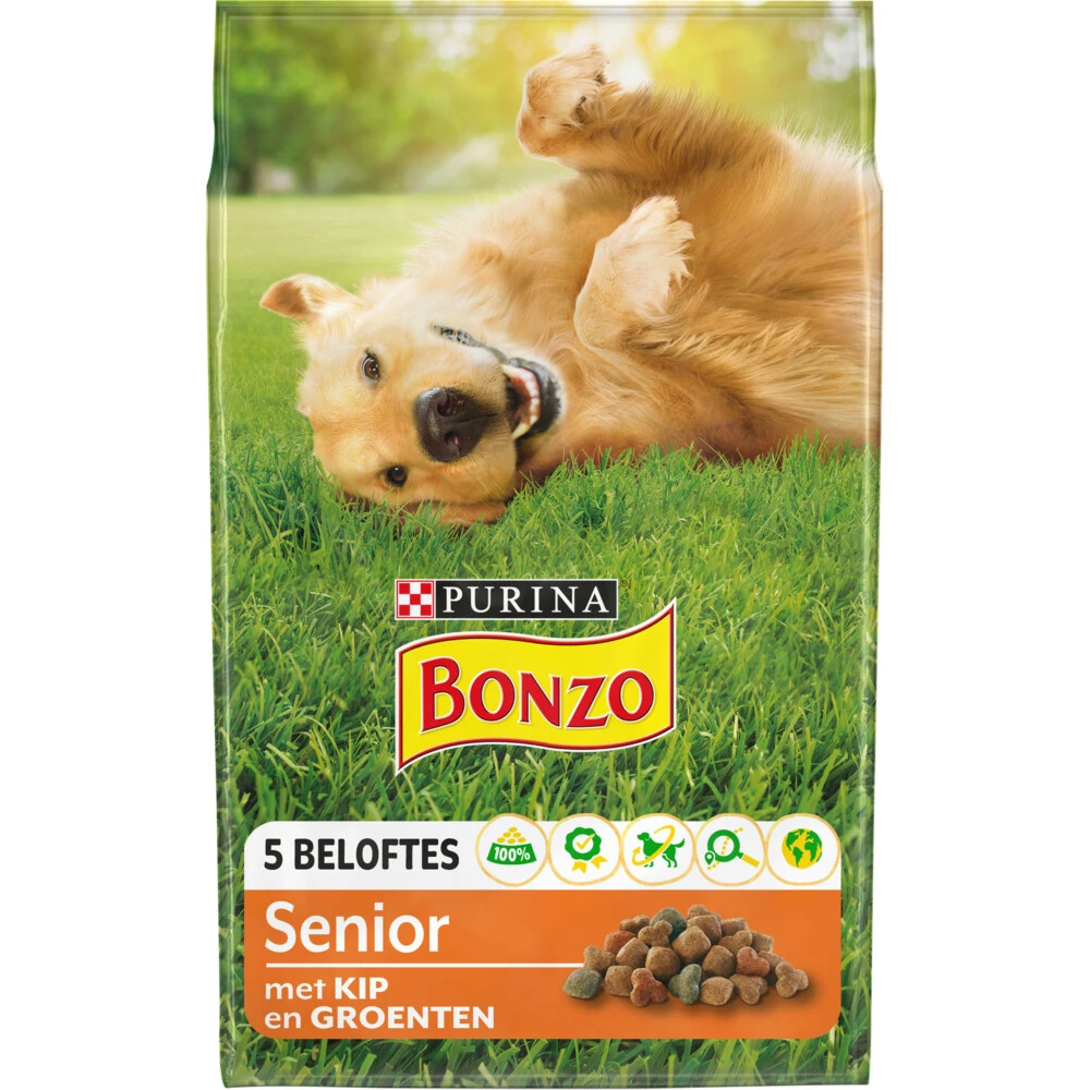 Bonzo Senior hondenvoerBonzo Senior met kip en toegevoegde groenten is een 100% complete en uitgebalanceerde maaltijd voor honden ouder dan 7 jaar, speciaal ontwikkeld om de gewrichten van je hond gezond te houden en zijn mobiliteit te ondersteunen.Ontwikkeld door Purina dierenartsen en voedingsdeskundigen;Toegevoegde vitamine E voor een natuurlijk afweersysteem;De juiste eiwit-en vitaminegehaltes voor een gezonde ontwikkeling;Bestaat uit 100% van de voedingsstoffen die je hond dagelijks nodig h