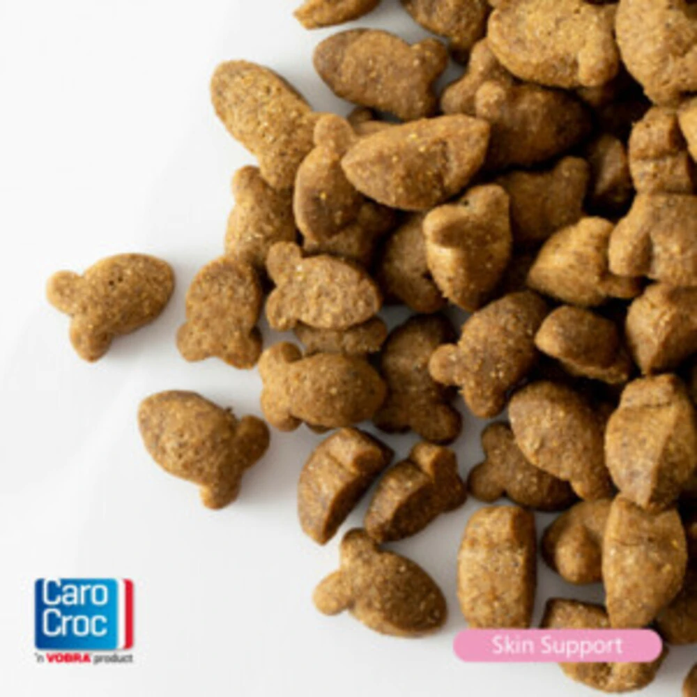 CaroCroc Hondenvoer Skin SupportEen stralende hond willen we allemaal. Een mooie huid en vacht gaan gepaard met goed voer. CaroCroc Skin Support is speciaal ontwikkeld om extra aandacht te geven bij een gevoelige huid of een verslechterde huid- en vachtconditie.De brokken bevatten verse zalm en zalmolie welke een glanzende vacht en een gezonde huid ondersteunen. Ook bevat CaroCroc Skin Support essentiële omega 3- en 6 vetzuren. Dit zijn vetzuren welke bijdragen aan de gezondheid, maar niet