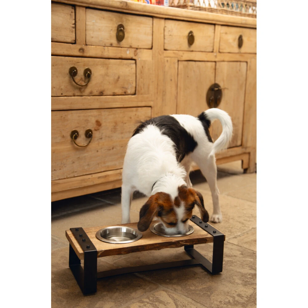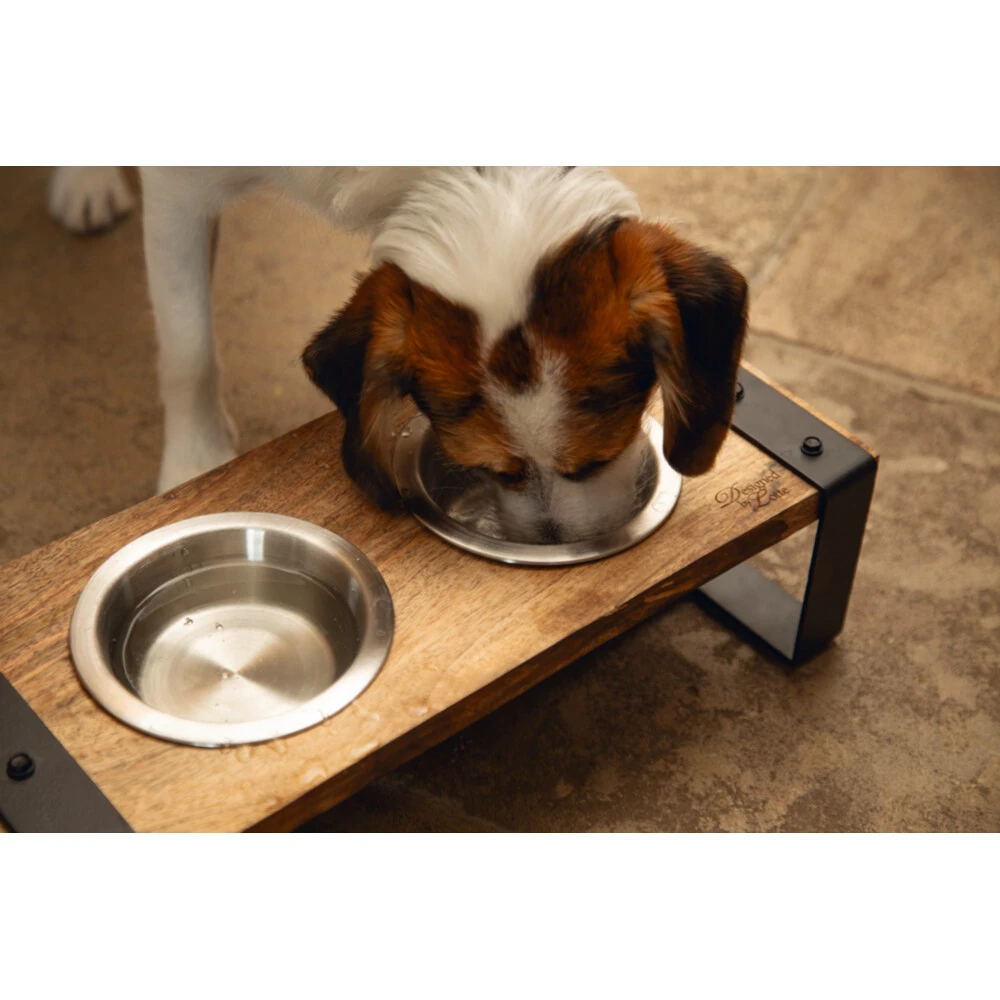 Designed by Lotte Dinerset Hout KarintoDeze Designed by Lotte dinerset van hout is een unieke toevoeging aan je interieur en past perfect bij een industriële stijl. Het gebruik van mango hout en stalen poten geeft deze set een stoere en robuuste uitstraling. Het dinerset wordt geleverd met twee eetbakjes van roestvrij staal, die gemakkelijk schoon te maken zijn in de vaatwasser. De verhoogde positie van de eetbakjes zorgt ervoor dat jouw hond een goede houding heeft tijdens het eten en niet