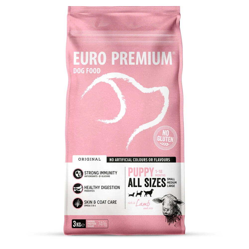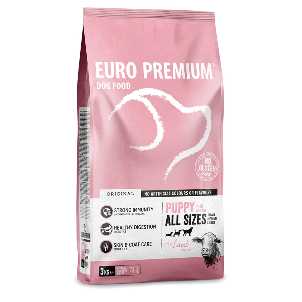 Euro-Premium Puppy Lam – RijstEuro-Premium Puppy All Sizes Lam & Rijst is een volledige, super-premium voeding voor opgroeiende honden met een voorkeur voor lam (Small/Medium 1-12 maanden en Large 1-18 maanden). Een optimale weerstand en een gezonde spijsvertering worden ondersteund door de toevoeging van een unieke blend van plantenextracten – rijk aan antioxidanten – aangevuld met prebiotica en β-glucanen.Een optimale verhouding Omega-3 / Omega-6 vetzuren bevordert een gez