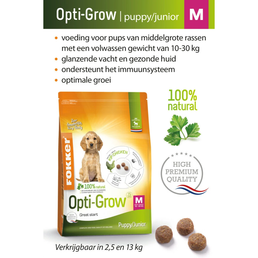 Fokker Opti-Grow M Fokker Opti-Grow M is een high premium hondenvoeding voor jonge honden van middelgrote rassen met een volwassen gewicht van 10 tot 30 kg. De uitgekiende selectie van ingrediënten staat garant voor een gelijkmatige groei. De ontwikkeling van gezonde botten en sterke spieren is de zekerheid voor een energieke en speelse pup. Noorse zalmolie ondersteunt een gezonde huid en een blijvend glanzende vacht. Tot de leeftijd van 12 maanden is dit product de perfecte start voor je hond.