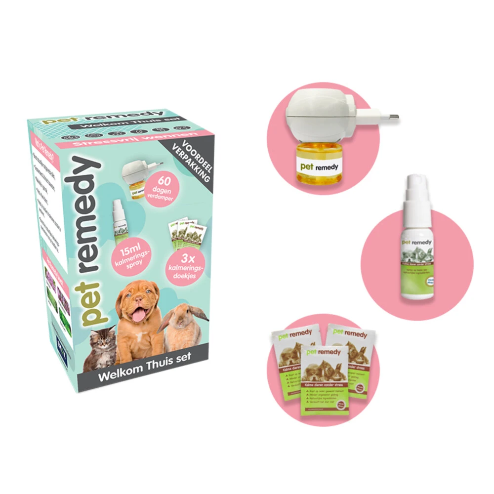 Pet Remedy Welkom Thuis SetDe Pet Remedy Welkom Thuis Set is 1 complete set waarmee je jouw pup, kitten of ander nieuw huisdier kunt laten wennen aan de nieuwe omgeving. Zo’n verhuizing kan voor veel huisdieren erg stressvol zijn. Pet Remedy bevat natuurlijke rustgevende oliën die jouw huisdier helpen te kalmeren. Pet Remedy werkt vrijwel direct en kalmeert je huisdier zonder te verdoven of te versuffen. Dit product bevat geen feromonen.1 Complete set om jouw huisdier stress-vrij te l