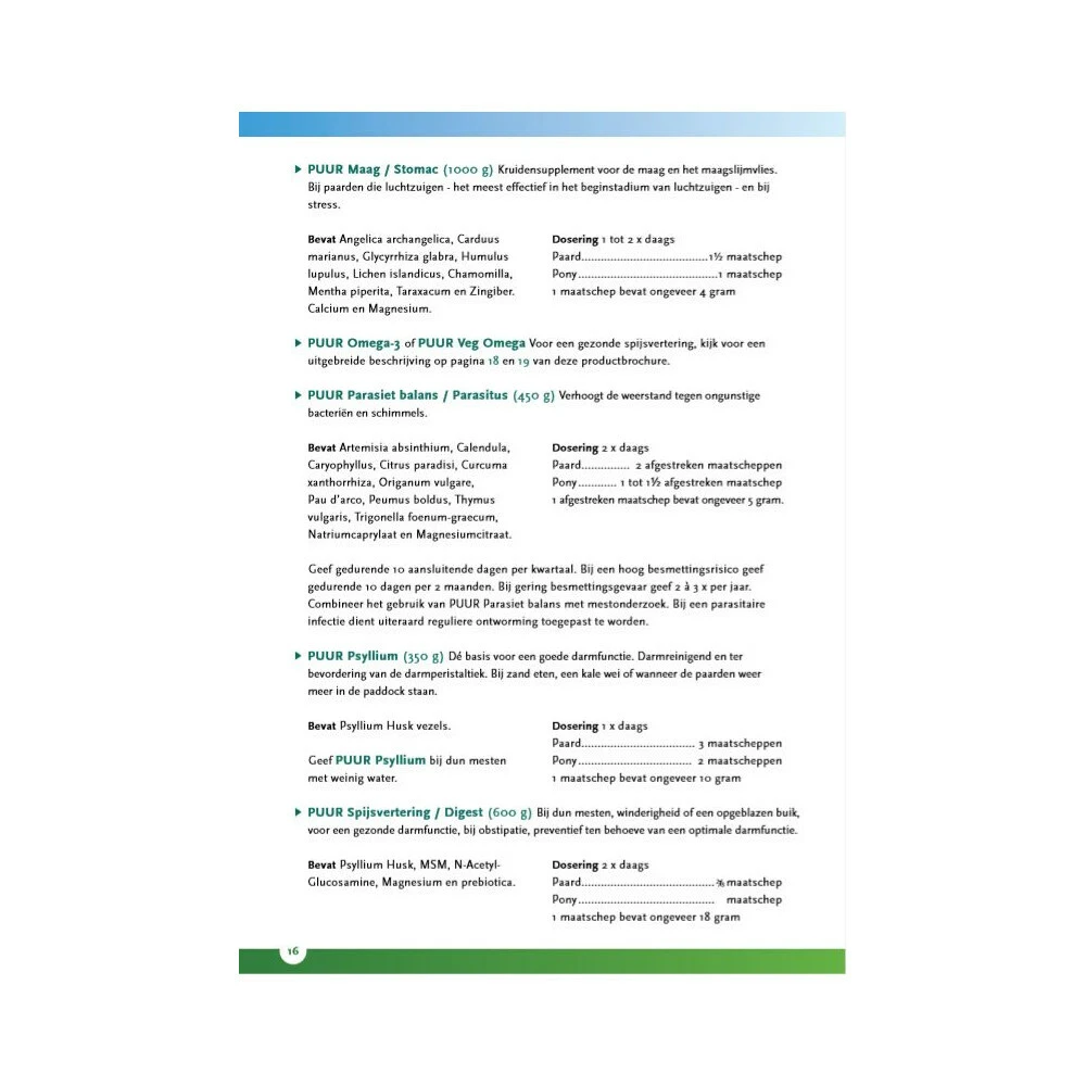 PUUR Stomac Paard – PonyPUUR Stomac ondersteunt de maag en de darmen. PUUR Stomac is geschikt is voor paarden met maagproblemen zoals: maagslijmvliesirritaties en maagzweren. Maar PUUR stomac is ook geschikt voor paarden met een gevoelige maag, die luchtzuigen (het meest effectief in het beginstadium van luchtzuigen), en bij paarden met stress. Puur Stomac is een aanvullend diervoeder en bestaat uit kruiden en mineralen voor een gezonde maag.Ondersteunt de maag en darmenAanvullend diervoederSpec