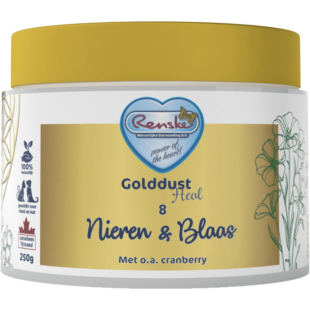 Renske Golddust Heal 8 Blaas & NierenGolddust Heal is een 100% natuurlijke lijn voedingssupplementen speciaal voor honden en katten. De Supplementen zijn allen ‘Bio-Energetisch Volmaakt’ wat betekent dat de ingrediënten zijn afgestemd op het energetische veld van jouw dier waardoor het product beter zijn werk kan doen.Golddust Heal bestaat een groot gedeelte uit biologisch lijnzaad of lijnzaad met gecertificeerde visolie (MOP). Het lijnzaad komt uit de kop van Canada w