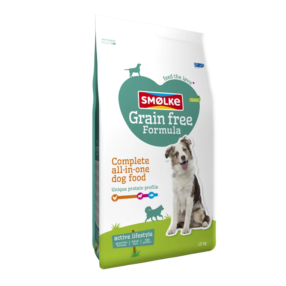 Smolke Graanvrij Hondenvoer AdultSmølke Grain Free Formula is een complete Alles-in-één hondenvoeding afgestemd op de behoefte van volwassen honden. Het recept van deze lekkere en gezonde hondenbrokjes heeft als basis drie verschillende dierlijke eiwitbronnen, namelijk (verse) kip, duurzaam gevangen vis en lam. De voeding is samengesteld zonder granen en er zitten geen kunstmatige geur-, kleur- en smaakstoffen in.Smølke gebruikt ook geen chemische antioxidanten en con