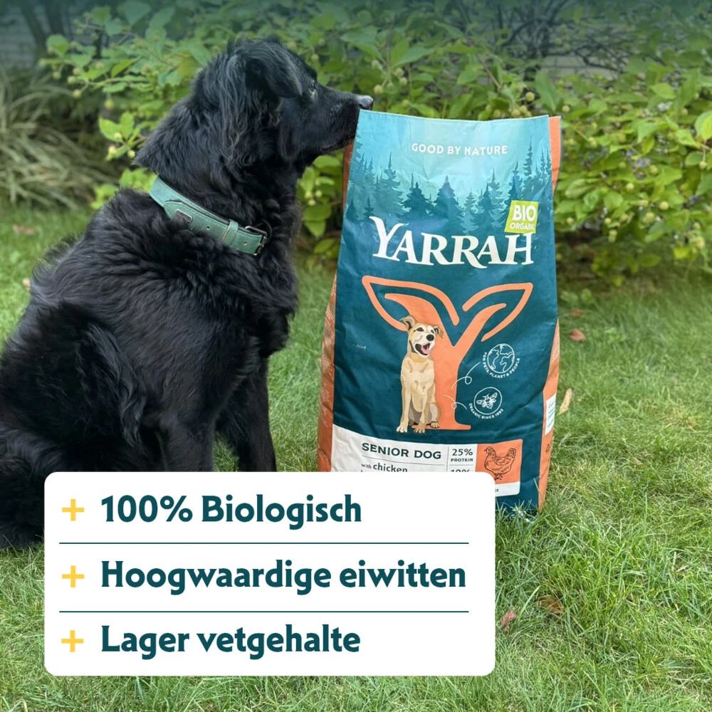 Yarrah Bio Hondenvoer Senior Kip Overheerlijke brokken met biologische kip, MSC-vis, biologische duivelsklauw, heermoes en rozenbottel voor honden van 7 jaar en ouder. Het biologische hondenvoer vormt een complete, voedzame en zeer smakelijke maaltijd voor je oudere hond. Zuiver biologisch voer en dus vrij van chemische geur-, kleur- en smaakstoffen, pesticiden en GMO, waarbij de best opneembare eiwitten zijn geselecteerd. Zo krijgt je hond precies binnen wat hij nodig heeft.Deze zak bevat